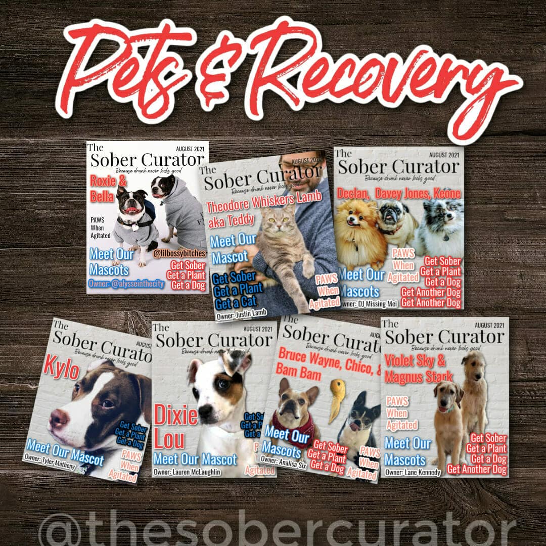 Get ready to meet our Mascots! In honor of our one-year anniversary, we gave careful consideration to the best way to celebrate. Earlier this year we had so much fun making our Sober Curators magazine cover mock-ups, we thought what better way to celebrate our one-year anniversary than to celebrate it with our fur babies?!?!?! Plus, it was a fun excuse to create magazine covers of our four-legged friends (and one special fish) that have been by our side through all the ups and downs of the last year. Sobriety combined with a global pandemic has been challenging, to say the least. For many of us, it would have been that much harder without our furry companions.