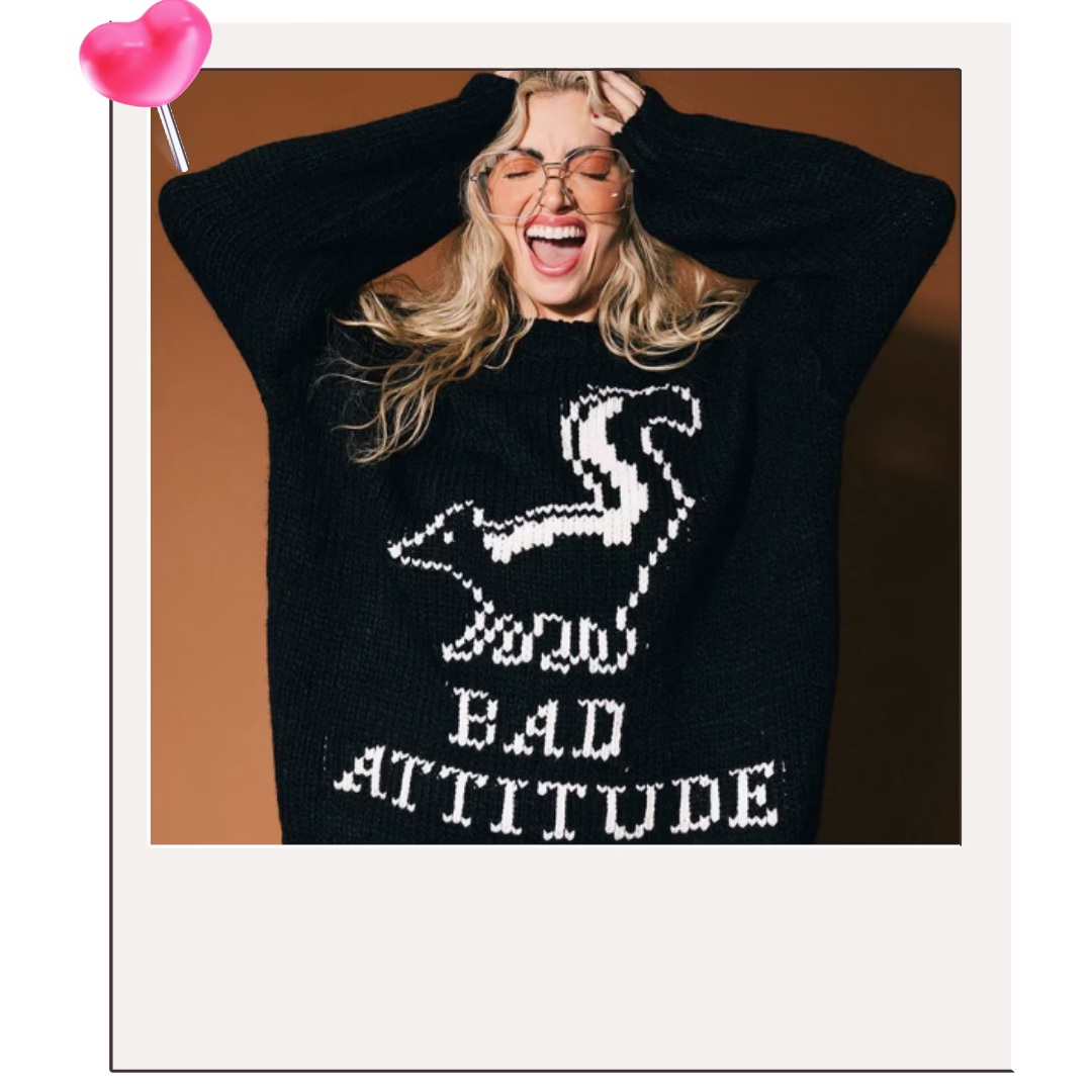 This sweater is oversized, chunky, plush, and clearly not here to be touched. “Bad Attitude” on the front. “Don’t touch me, thanks!” on the back. Honestly? A public service announcement. #ADDTOCART